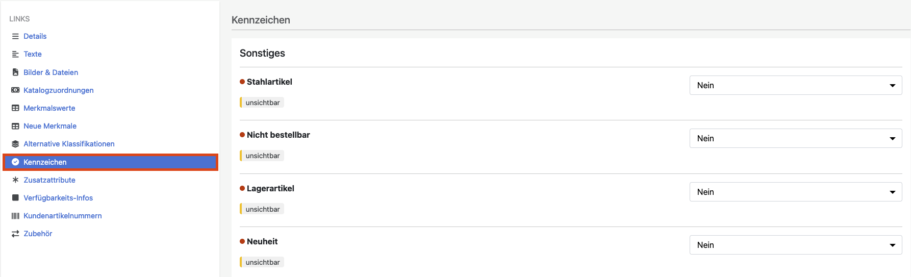 Können analog zu den Zusatzattributen unabhängig von der Produktgruppe oder der Klassifikation gepflegt und